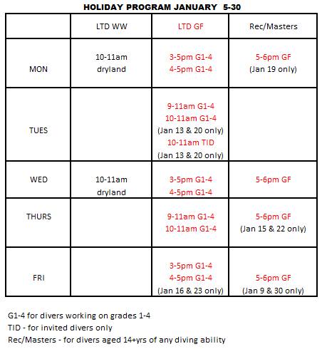 LTD Grade 1-4: 2hr session (G1-4) - our most popular holiday This class is divided into dryland and pool components, starting with dryland in a designated room with gym mats etc. At West Wave it is located opposite the main changing room entrances and at Glenfield down by the squash courts. For those unfamiliar with dryland, here divers learn the technical elements of diving in a safe environment to build confidence especially when learning some of the harder skills. This along with specific strength exercises, basic gymnastics, mobility and body awareness helps divers speed up their diving development. Cost is $34 per session with discounts available if you book more than 1 session per week per diver at one time (if bookings are not made in one sitting they will be charged at the daily rate for that week).